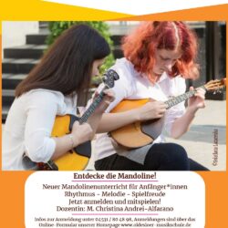 Entdecke die Mandoline! Neuer Gruppenunterricht für Anfänger*innen, freitags im Bürgerhaus. Unsere Dozentin M. Christina Andrei-Alfarano bietet diesen Unterricht im Bürgerhaus an. Rhythmus – Melodie – Spielfreude Unterrichtstag: Freitag, 14-tägig Leitung: M. Christina Read more about Gruppenunterricht Mandoline[…]