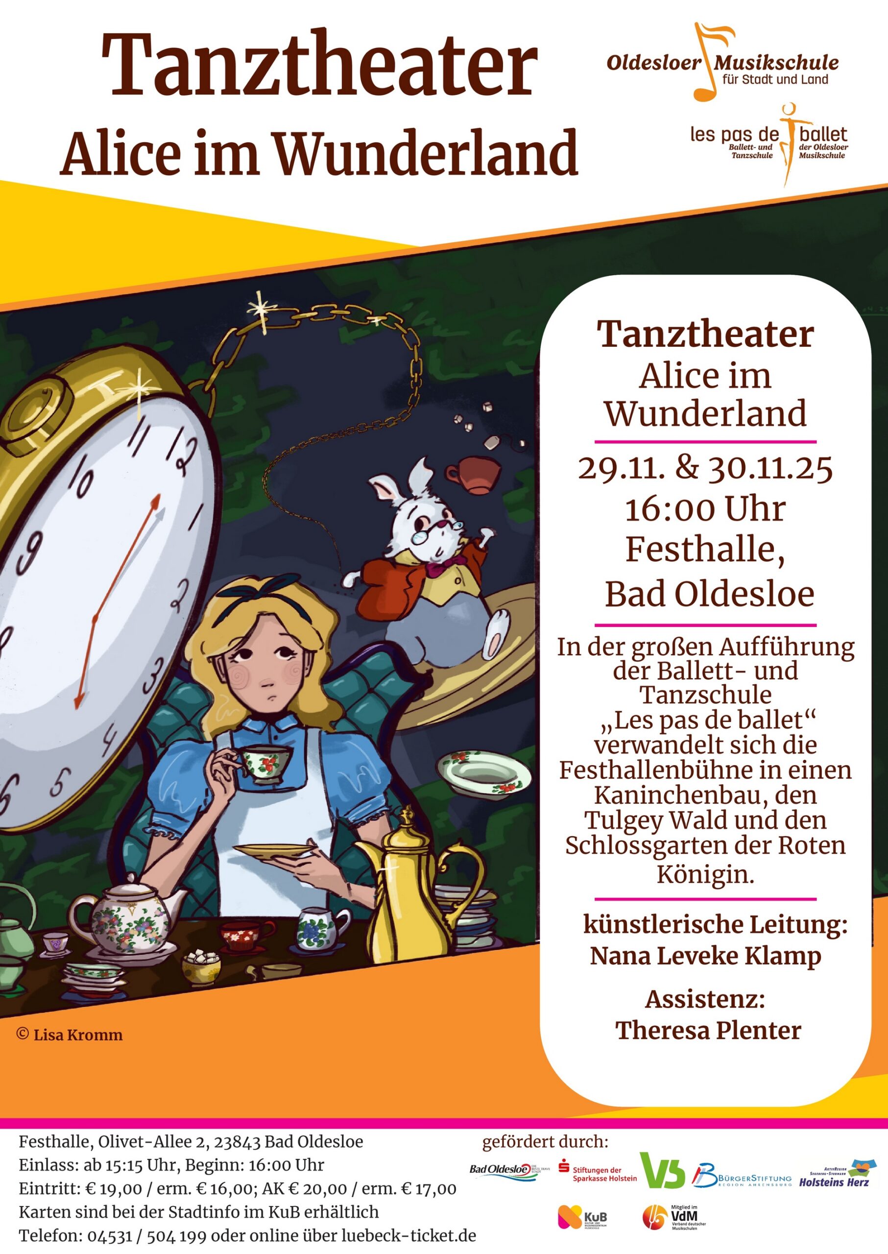 Festhalle Bad Oldesloe, DeutschlandAufführung unserer Ballett- und Tanzschule "Les pas de ballet". Mit den Schüler*innen unserer Ballett- und Tanzschule verwandelt sich die Festhallenbühne in einen Kaninchenbau, den Tulgaywald und den Schlossgarten der Roten Königin. Der Nichtgeburtstag wird gefeiert, weiße Rosen werden rot gestrichen und es wird schwungvoll Flamingocroquet gespielt. Samstag, 29.11.2025, 16:00 Uhr, Einlass ab 15:15 Uhr, Festhalle Read more about Tanztheater „Alice im Wunderland“[...]